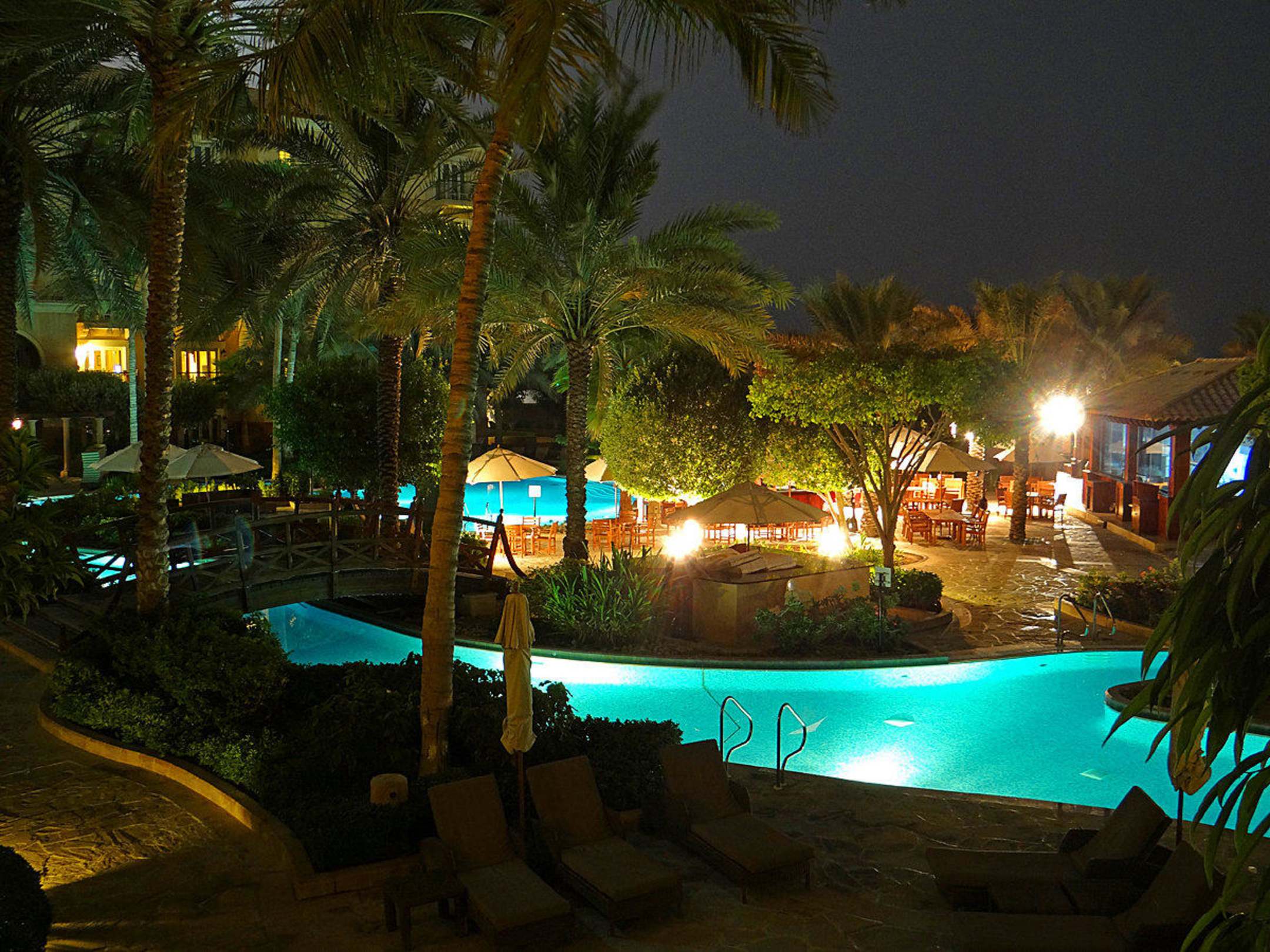 Blick vom Zimmer auf die Poolanlage am Abend