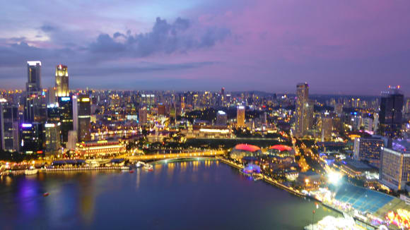 Ausblick in der Dämmerung vom Sky Park des Marina Bay Hotel