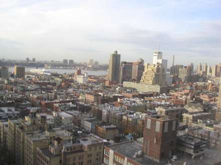 Aus diesem Fenster blickt man über die achte Avenue Richtung Hudson River auf die Anlegestelle der Kreuzfahrtschiffe und des Flugzeugträgers Intrepid.