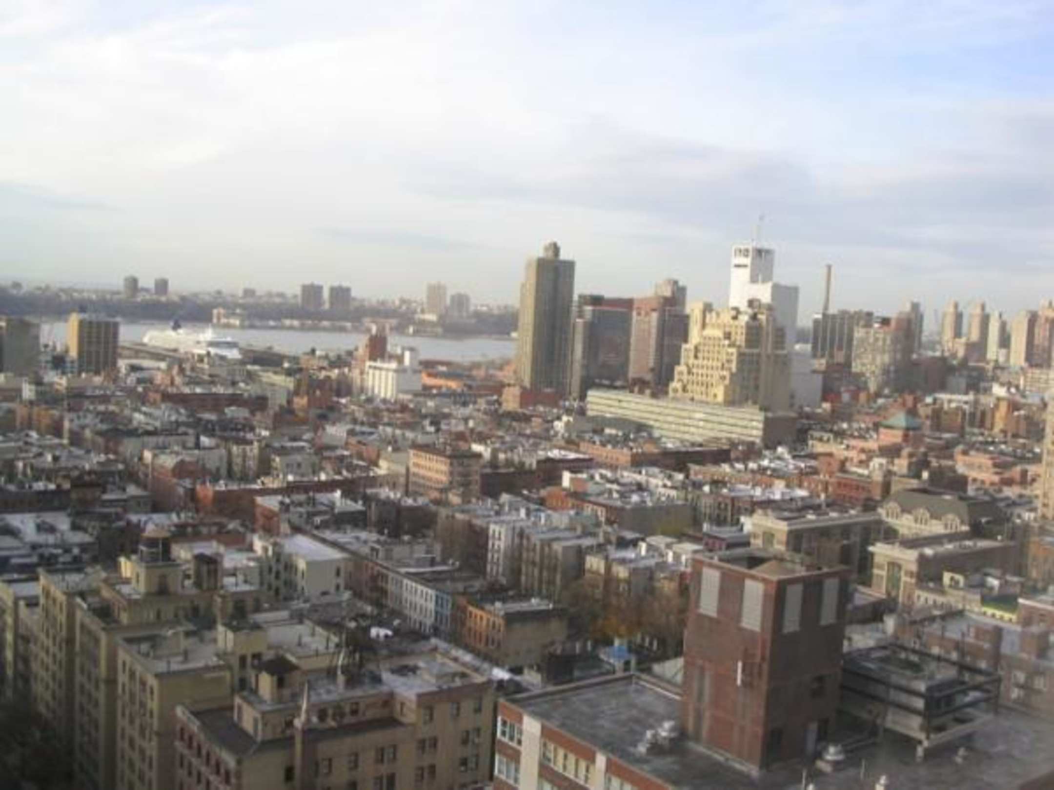 Aus diesem Fenster blickt man über die achte Avenue Richtung Hudson River auf die Anlegestelle der Kreuzfahrtschiffe und des Flugzeugträgers Intrepid.