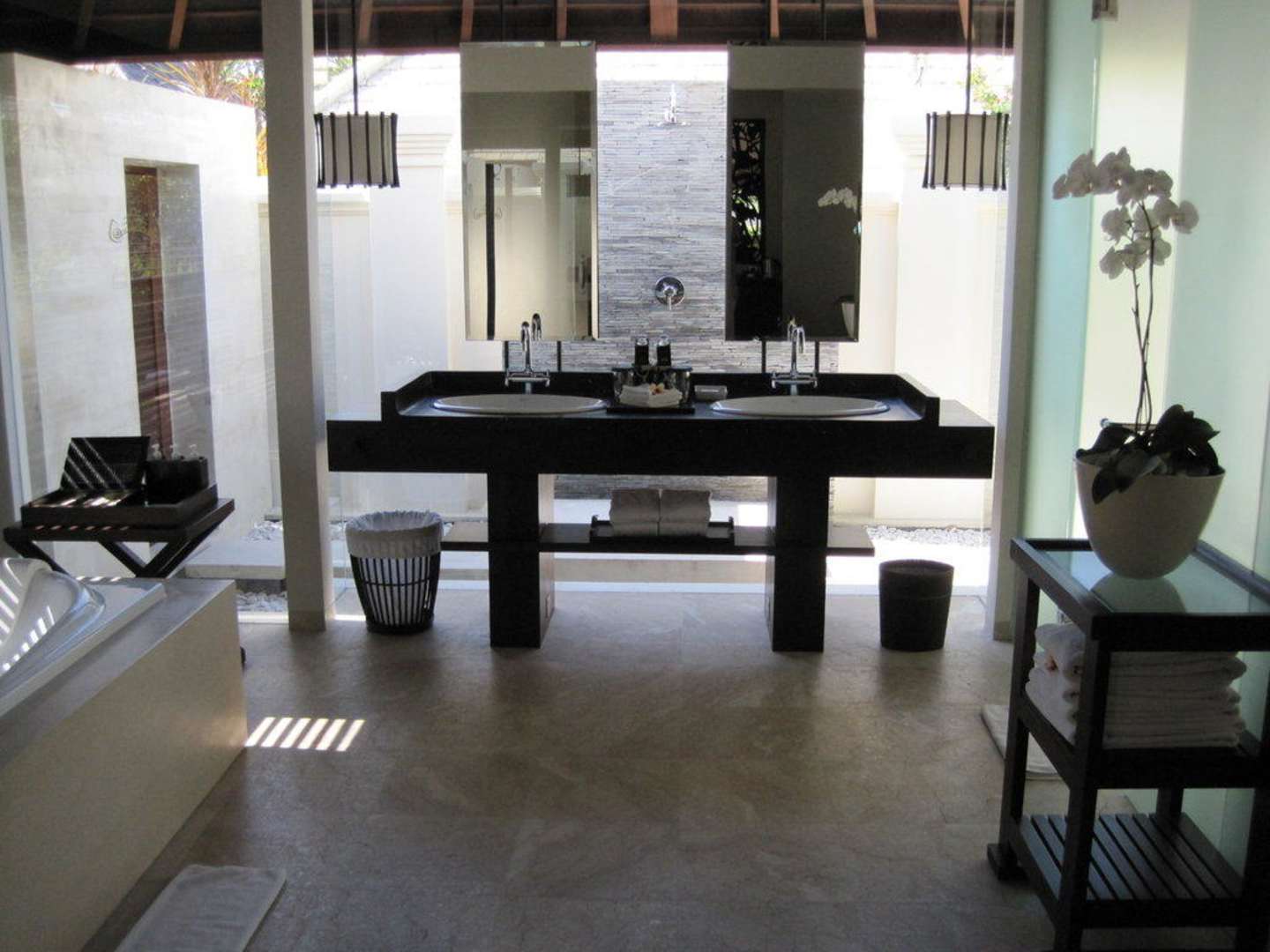 Badezimmer in der VillaRoyal Santrian Villa 211. Badezimmer. Dahinter Außendusche. Rechts: WC und Innen-Dusche