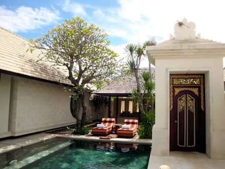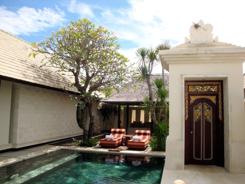 Pool und Daybed und Villa Eingang