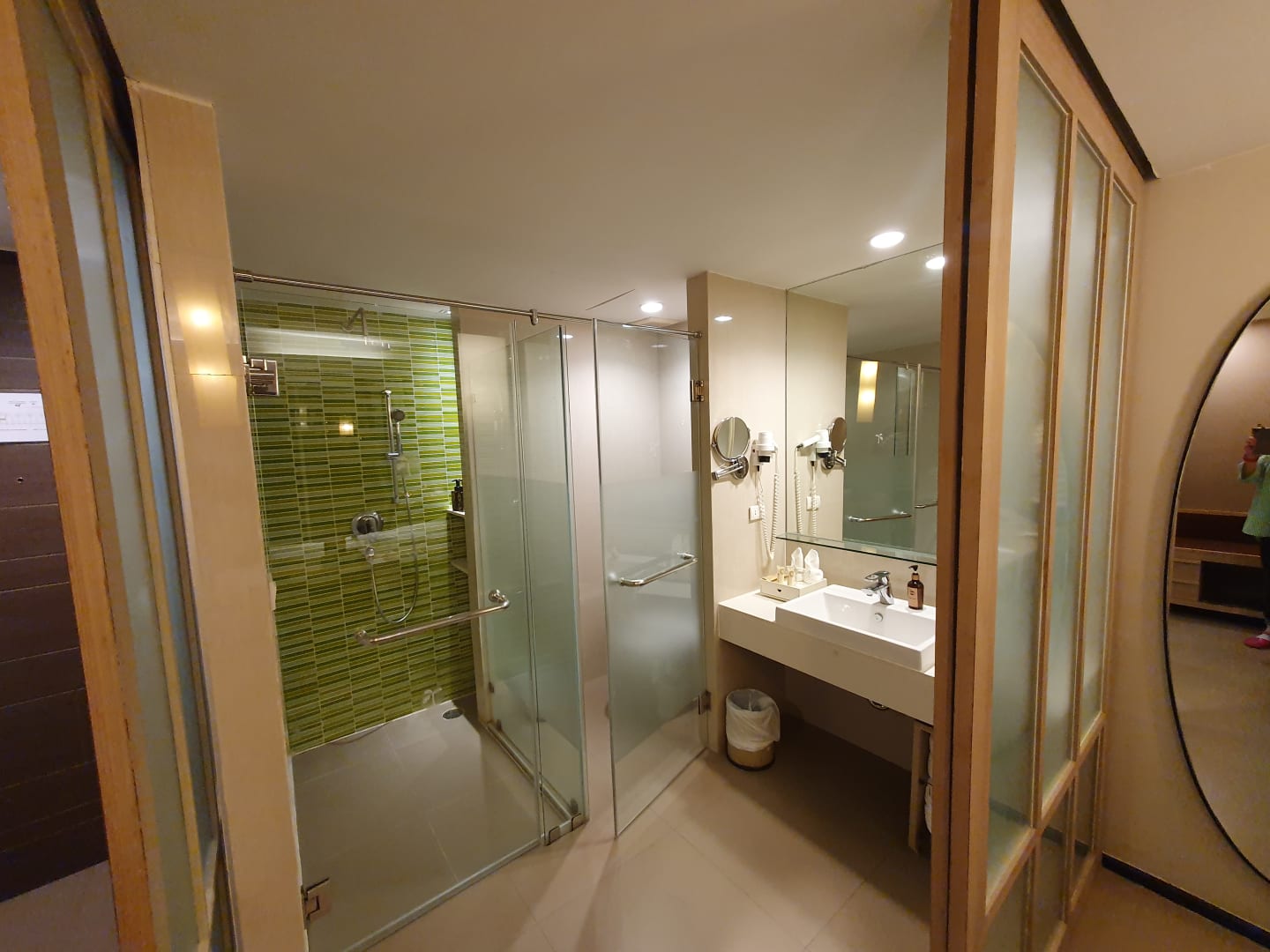 Das Bad ist durch zwei Schiebewände vom Schlafbereich getrennt.