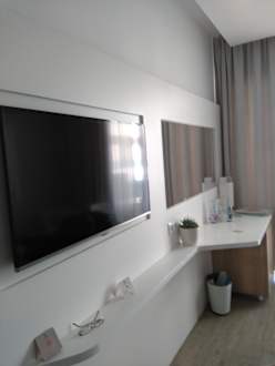 Flachbildschirm und grösserer Spiegel mit Schreibtisch und Minibar ( alles gegenüber dem Bett).