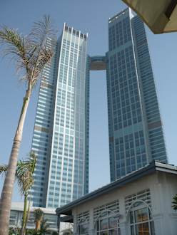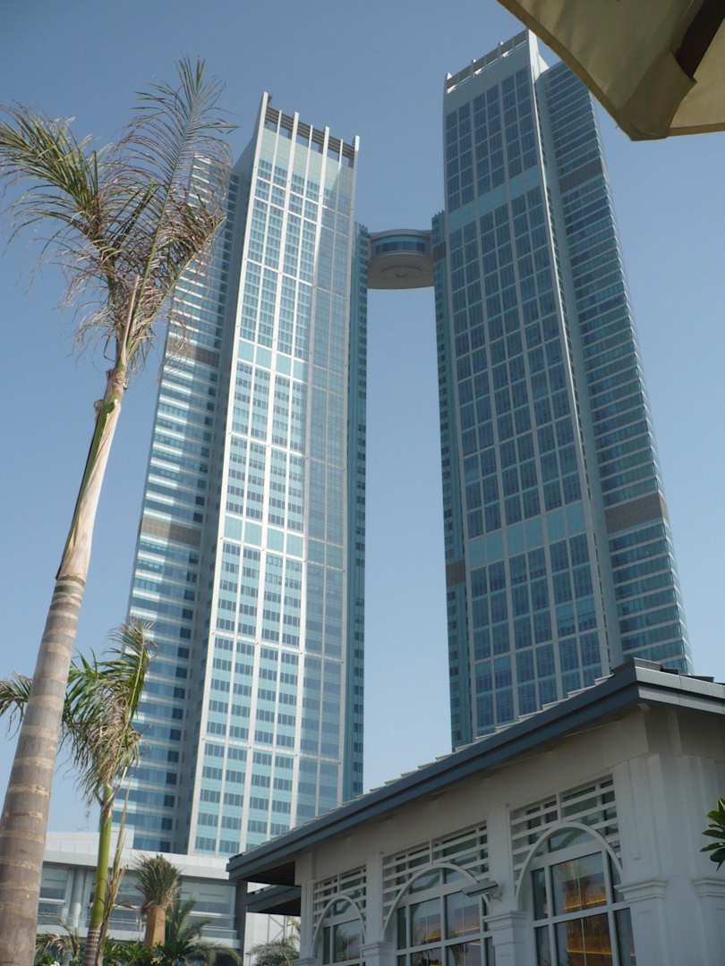 Vom 34. Stockwerk hatten wir eine wunderbare Aussicht auf die Ethihad Towers (nachts toll beleuchtet) und das Emirates Palace Hotel in der Bucht