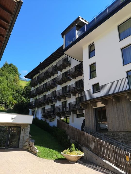 Seitenansicht Hotel. Zimmer mit seitlicher Sicht zum Dorf und den Bergen. Zi. 307 2. von rechts.