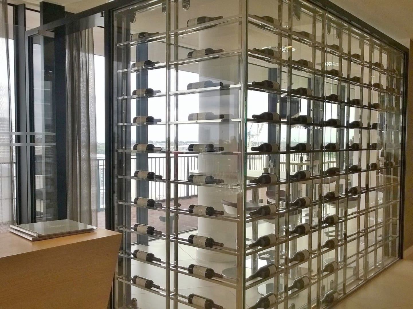 Blick von der Lobby in einen Teil der Bar (hinter dem eleganten Glasregal)