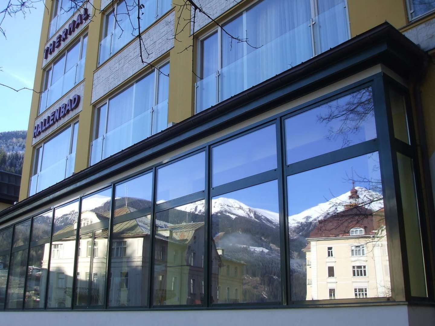 Diese Spiegelung des Badgasteiner Spielcasinos rechts und vom Hotel Weismayer links habe ich Anfang Dezember 2009 festgehalten.