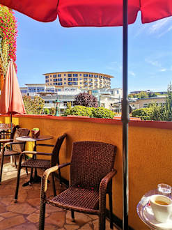 GastroVon der kleinen Hotelterasse hat man einen herrlichen Blick auf die Therme und die sie umgebenden Hotels.