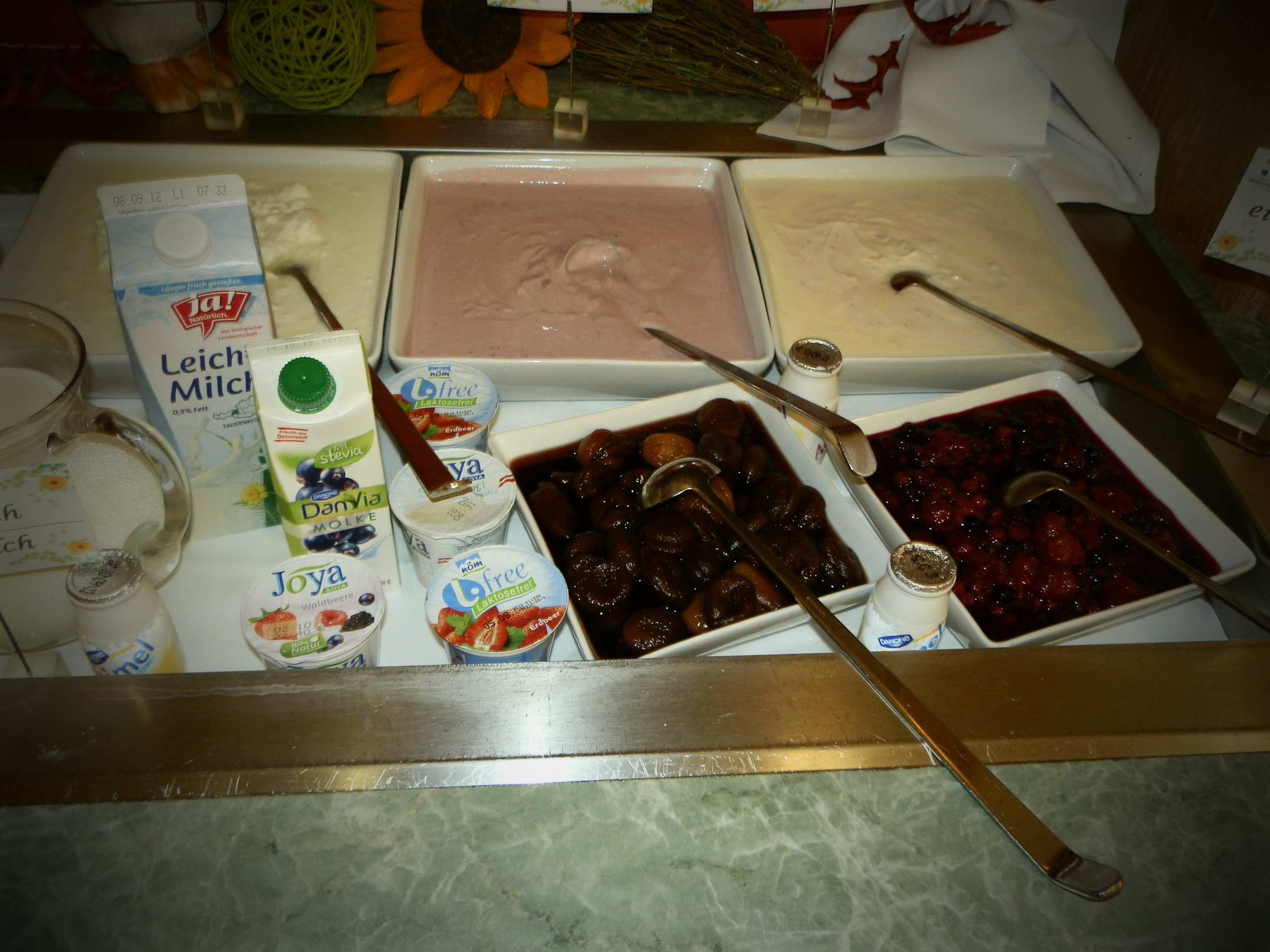 Široký výber jogurtov a mliečnych výrobkov na raňajky, v ponuke aj bezlaktózové as ójové mlieka, ovocné šaláty