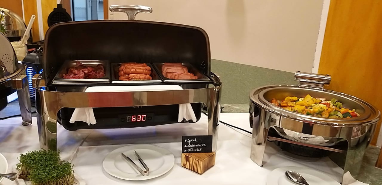 Frühstücksbuffet, heisser Fleischkäse, Würstchen und auch gekochtes Gemüse!