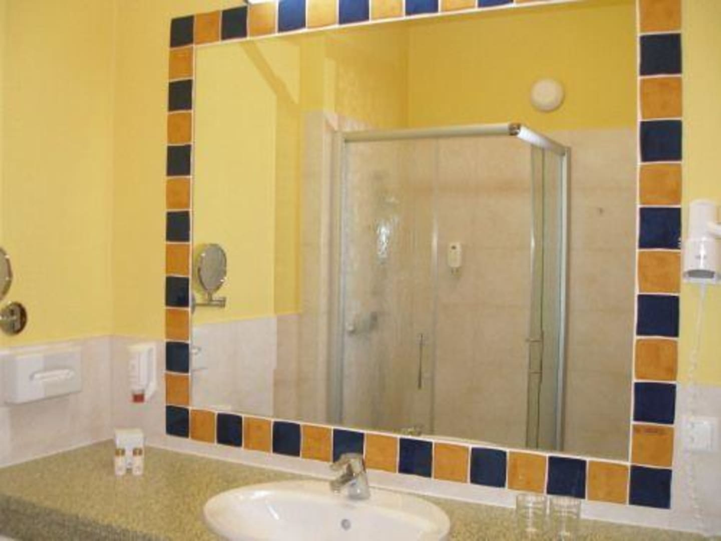 Badezimmer, die Dusche spiegelt sich schon im Badezimmerspiegel.