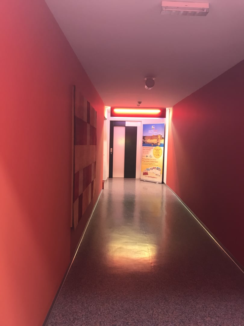 Der Regenbogenbademantelgang als Durchgang vom Hotel zur Therme, beheizt.
