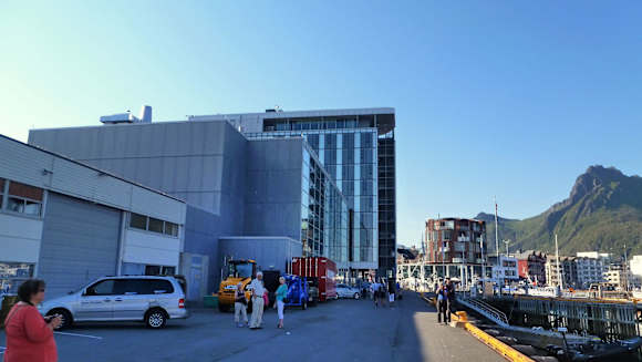 Blick vom Hurtigruten-Schiff zum Hotel