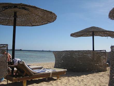 Liegen und Schirme am Strand
