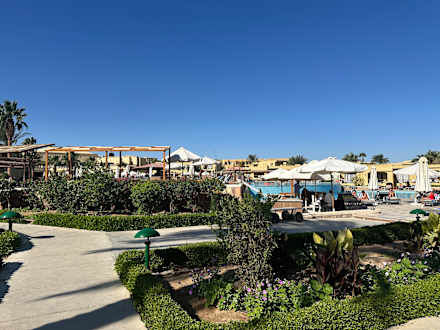 Blick auf den Pool und die Poolbar, im Hintergrund das Hauptrestaurant