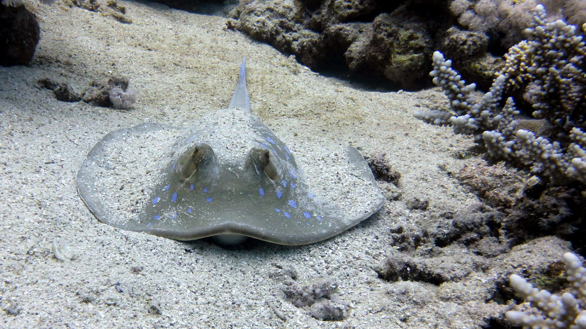 ...Tauchen am Nord-Riff: Blaupunkt-Stechrochen...