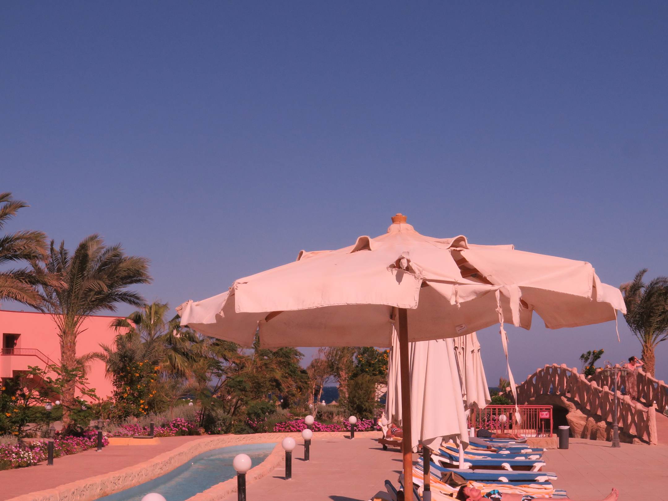 Ein Sonnenschirm dem der Wind und die Zeit arg zugesetzt hat.