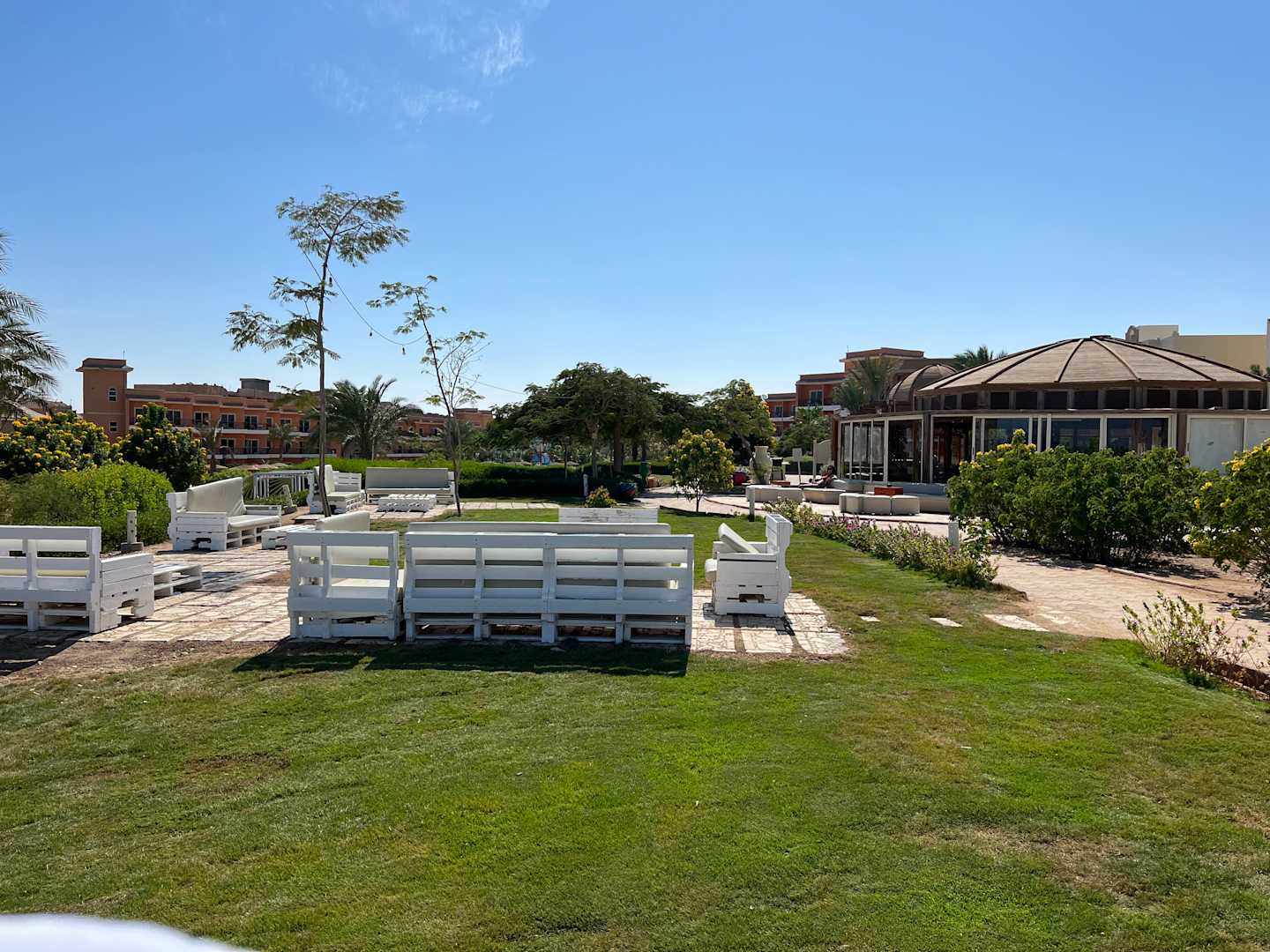 Blick vom Strand kommend Richtung Pool