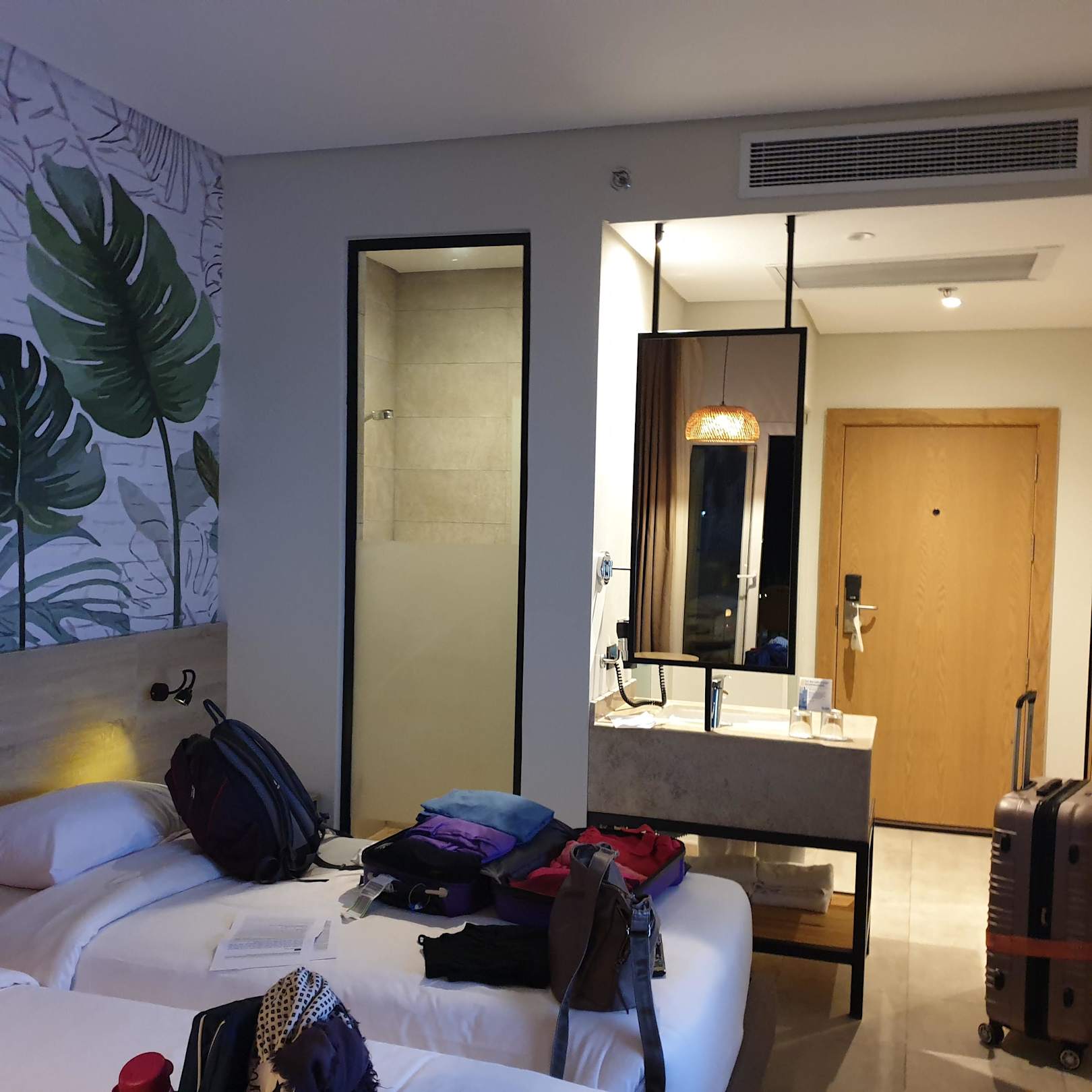 mit Blick in die Dusche vom Bett aus.