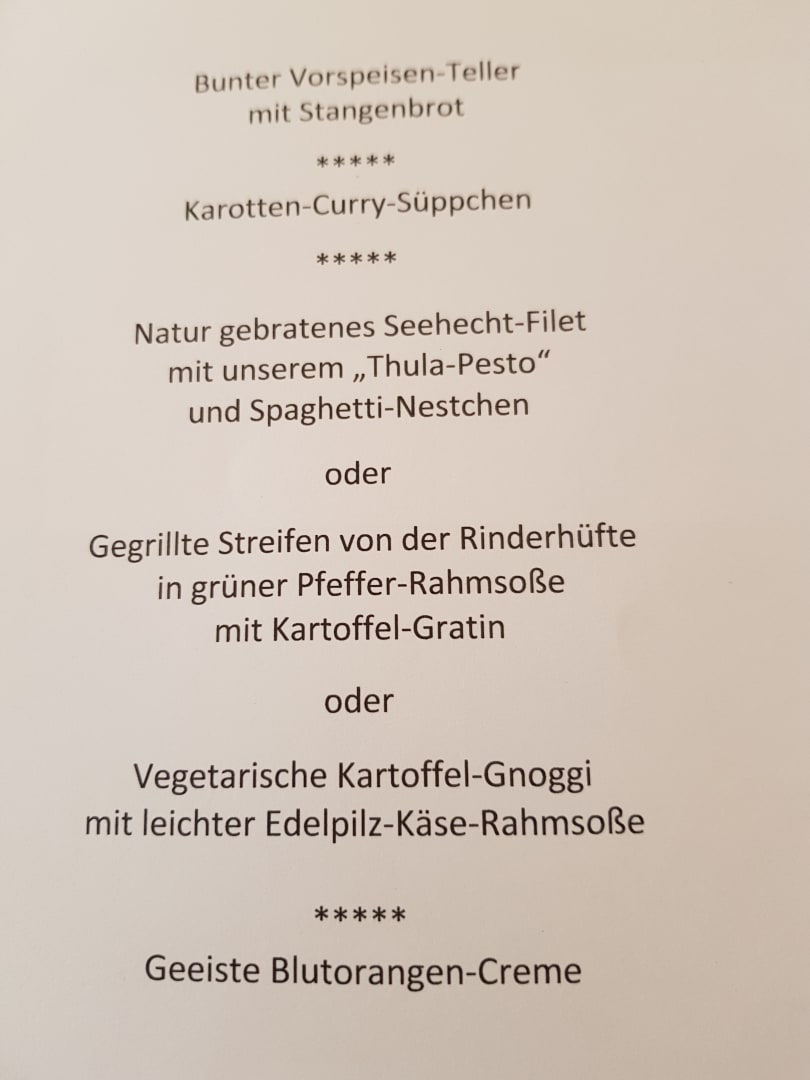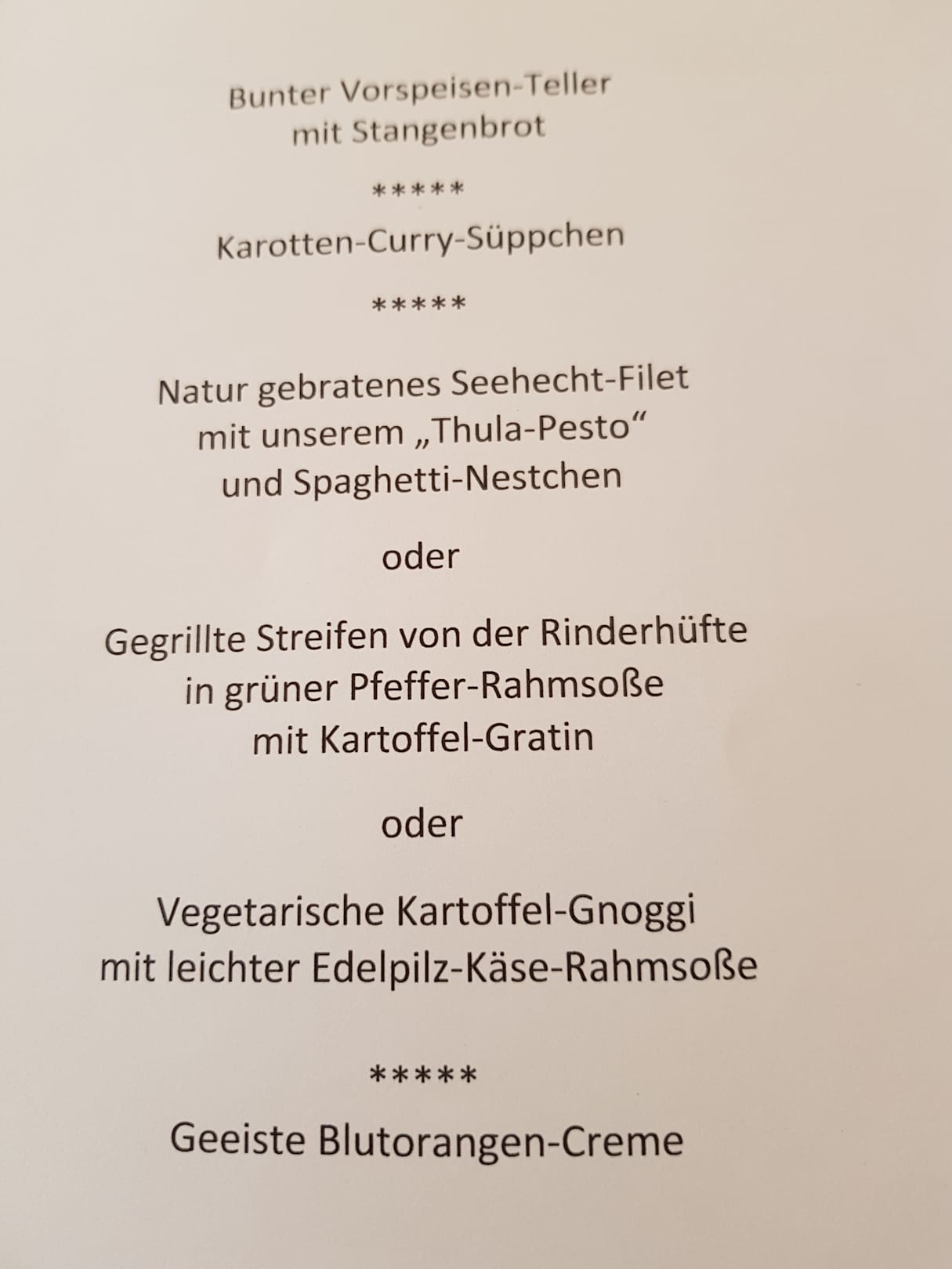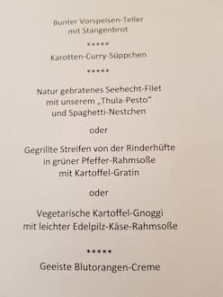 Speisekarte mit drei Gerichten zur Auswahl. Zum Abendessen