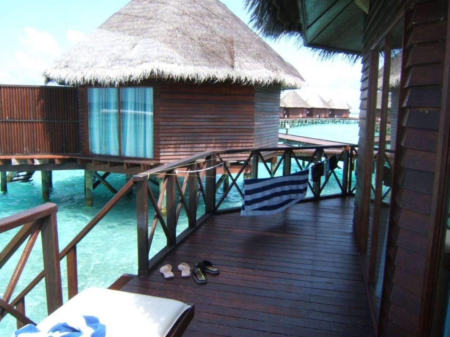 Sicht auf die andere Seite der Terrasse des Wasserbungalows