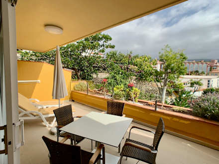 ZimmerGroßer Balkon mit zwei Liegen, Sonnenschirm, Tisch und vier Stühlen. ca. 20qm. Toller Ausblick auf Teide und Puerto.