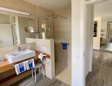 Badezimmer mit Badewanne und Dusche. Normaler Duschkopf sowie Regendusche. Föhn vorhanden.