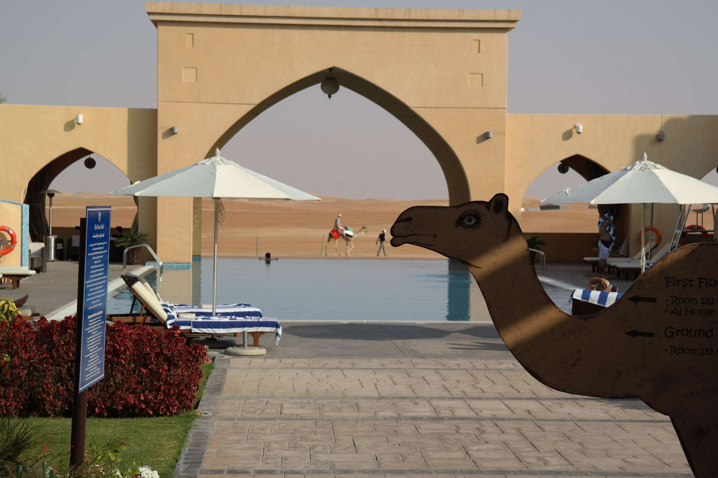 Blick vom Innenhof über den Pool in die Wüste