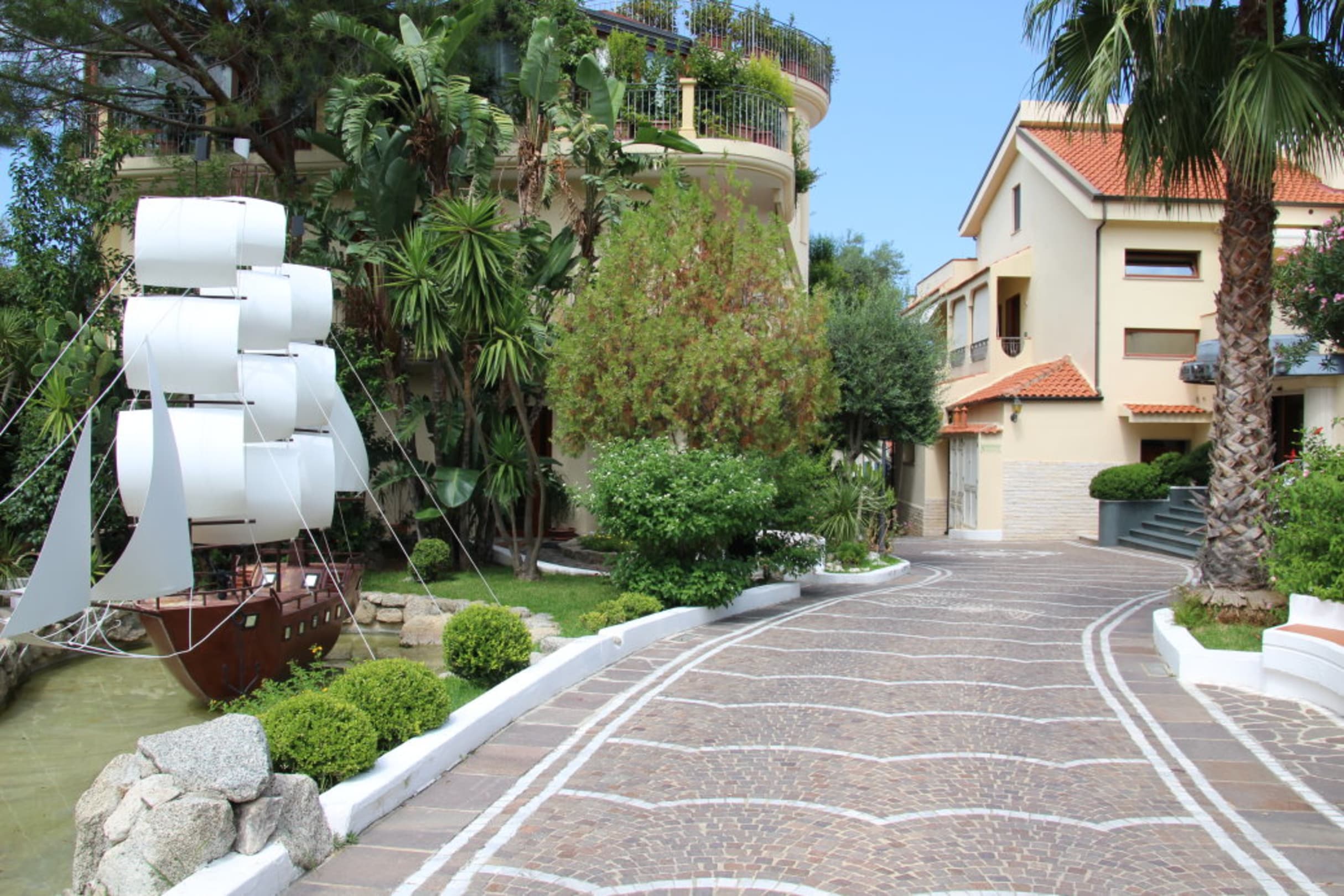 Eingangsbereich Hotelanlage (Gebäude links ist ein anderes, aber Partnerhotel, Tirreno-Gebäude liegen weiter hinten, dort auch ausreichend großer Parkplatz)