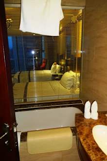 Zimmer 1803 durch die Glasscheibe vom WC / Bad aus gesehen