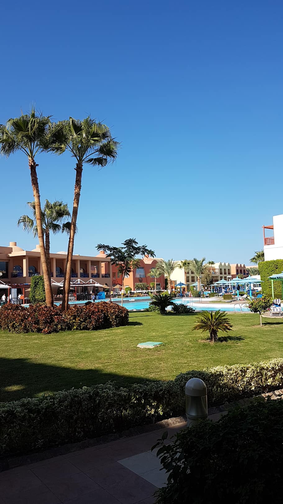 Ausblick vom Zimmer im Untergeschoß zum Pool hin.