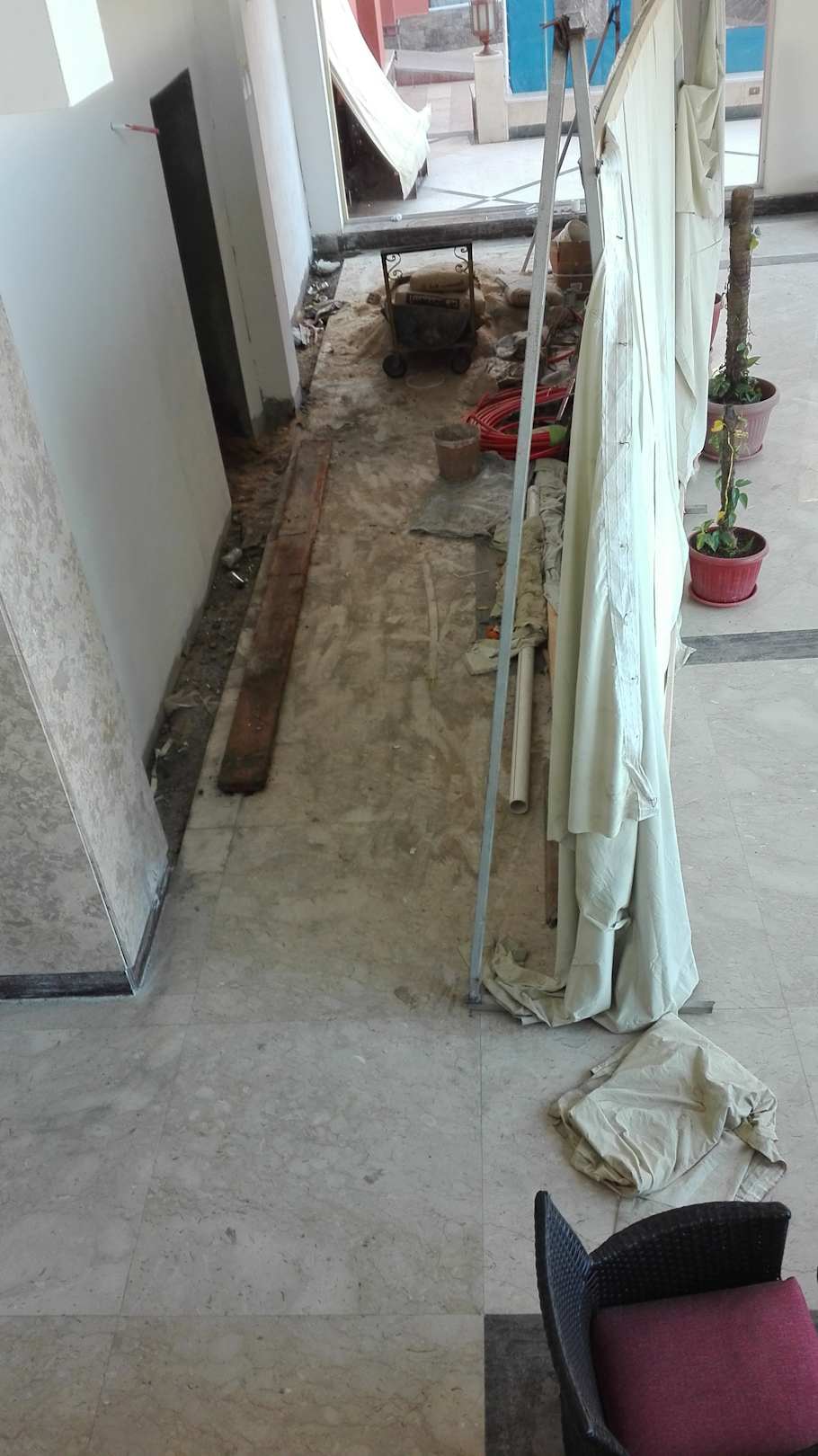 Baustelle unterhalb der Rezeption. Sogar während des Verkaufsgespräches durch Alltours -Reiseverkäufer. Bohrhammer im Betrieb. Video darf nicht eingestellt werden da Mitarbeiter zu sehen...