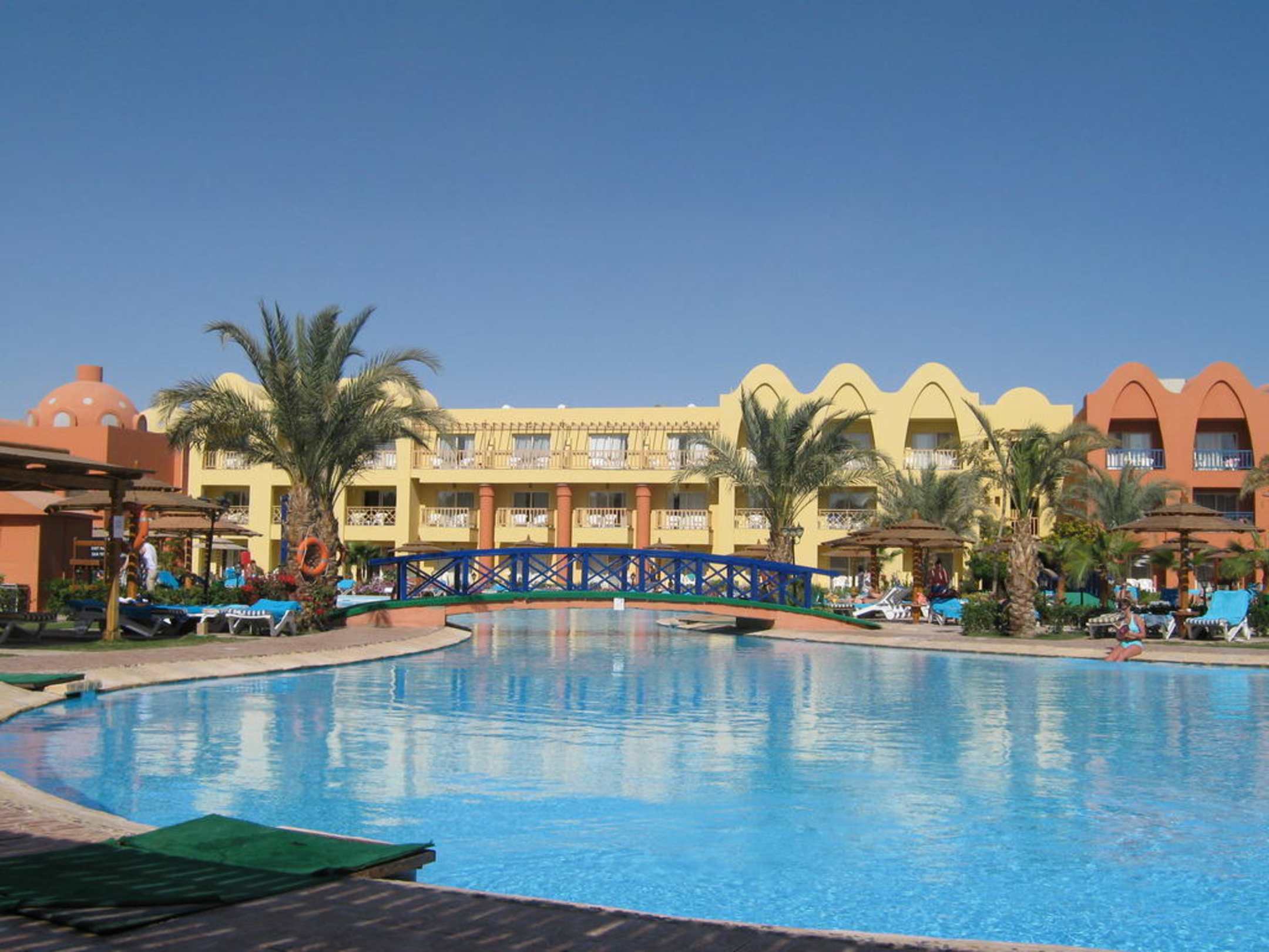 Blick von der Liege auf die Poolanlage