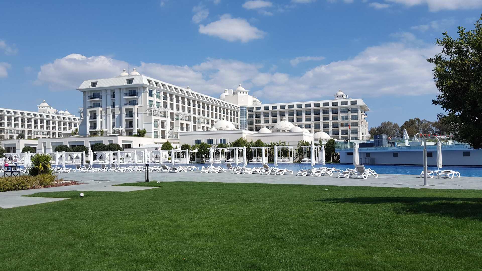 Toller Anblick von der FlussseiteGleich hinter dem grünen Rasen beginnt eine der größten Poolflächen an der türkischen Riviera.