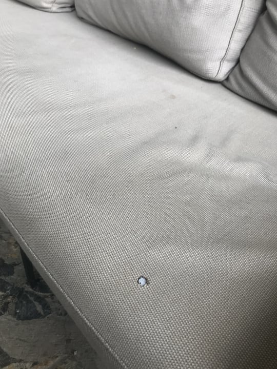 Fast alle Polster sind schmutzig und mit Flecken versehen.