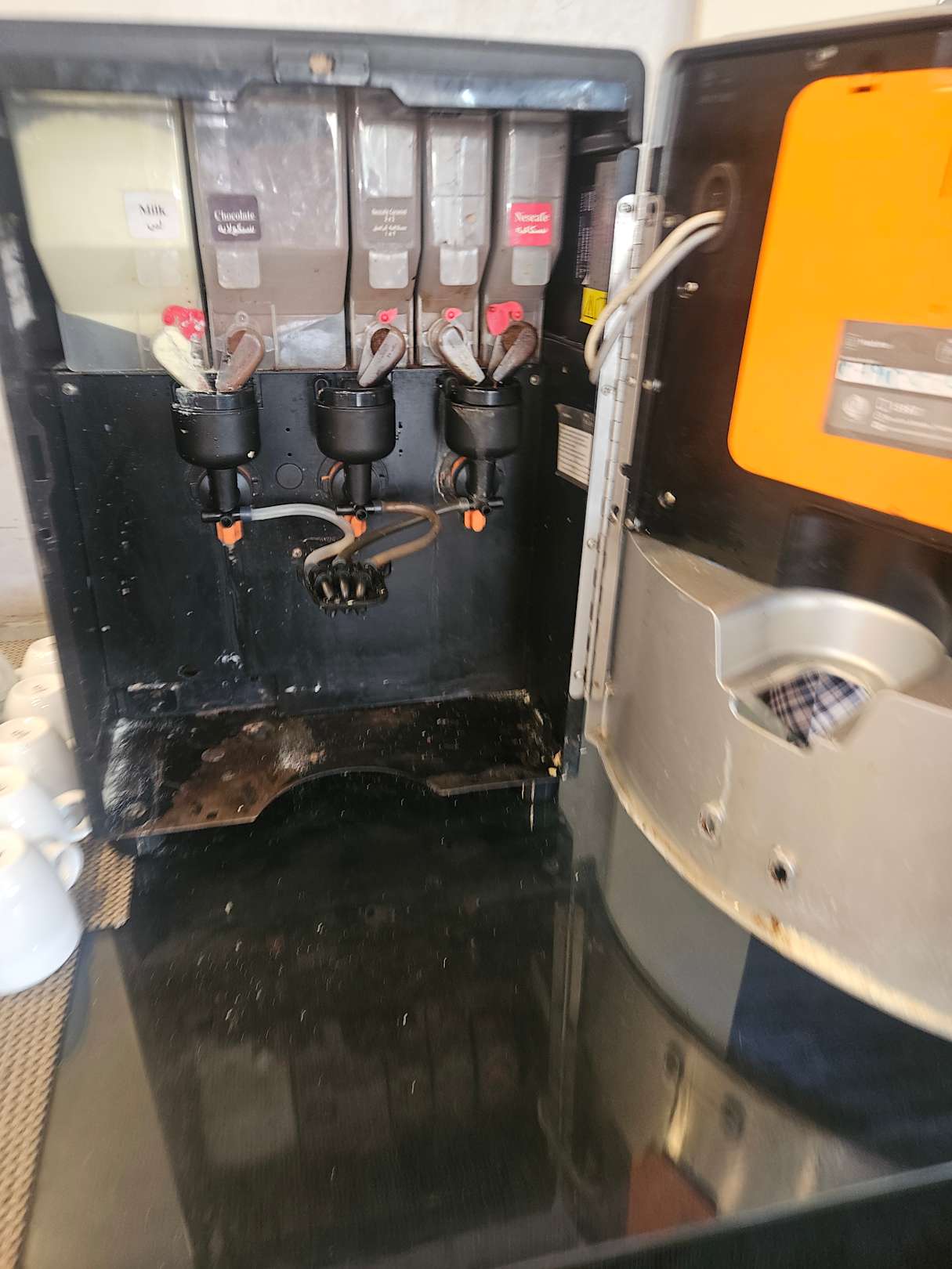 verschmutzter Kaffeeautomat beim Frühstück