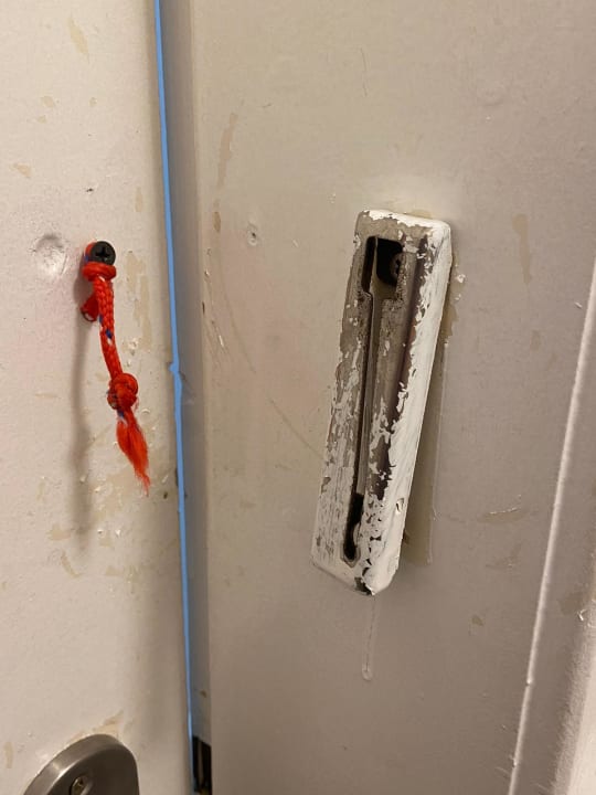 Das sollte der Verschluss der Badezimmertür sein, kreativ, aber das Band war zu kurz.