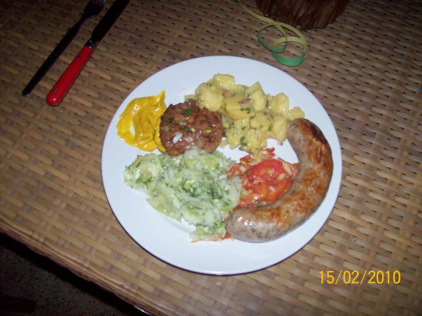 Katroffelsalat mit Rostbratwurst, Bulette und Salat