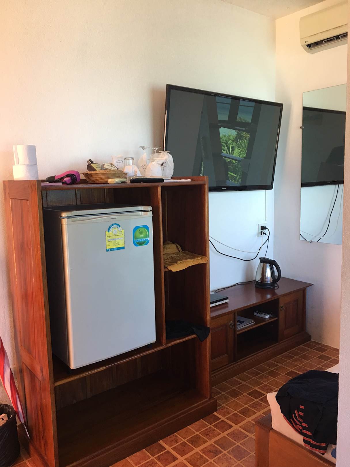 Mein Blick auf den Kühlschrank, vorne im Regal, dahinter der große TV Flachbildschirm