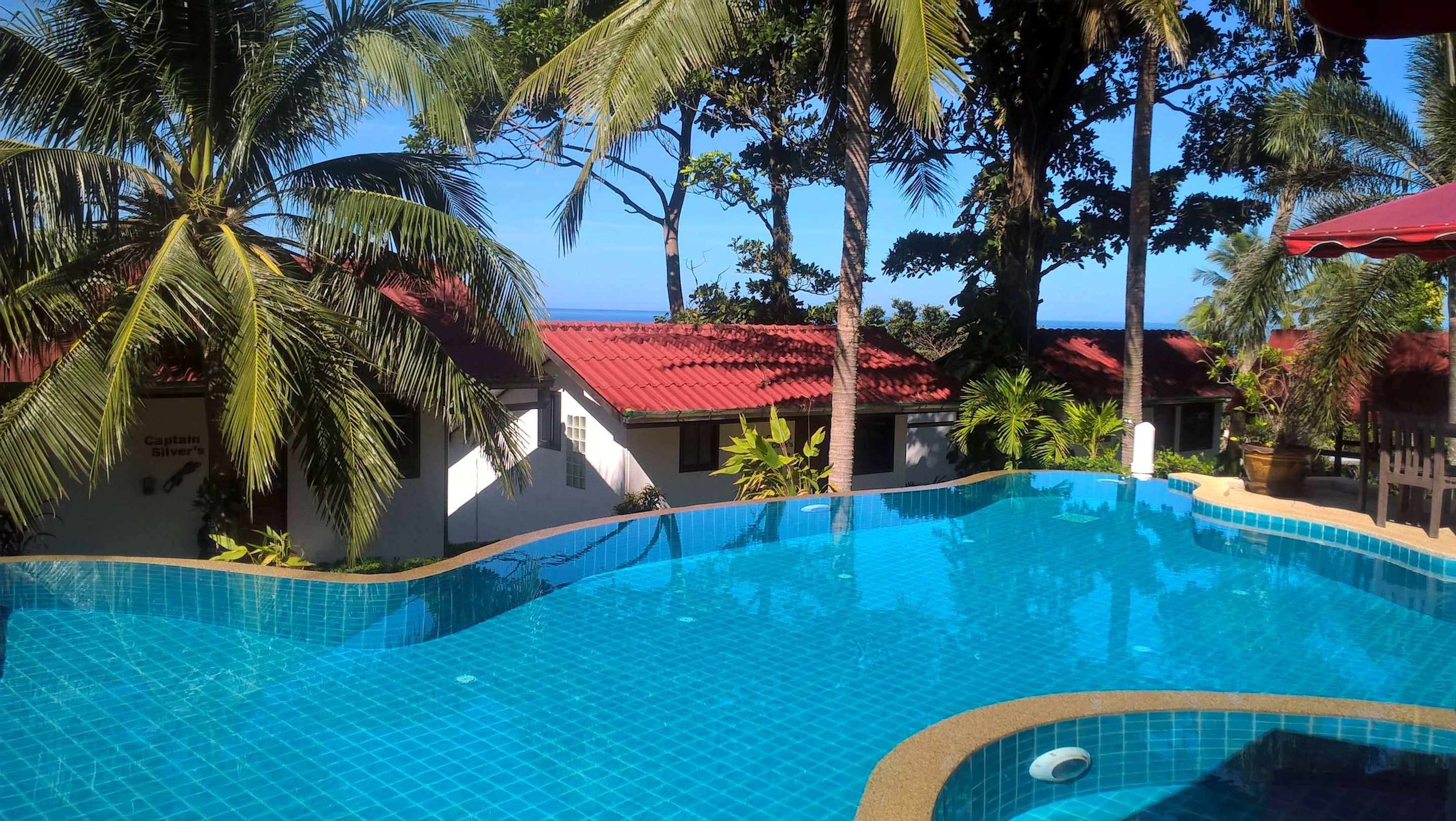 Blick vom Pool auf die Meerblickbungalows