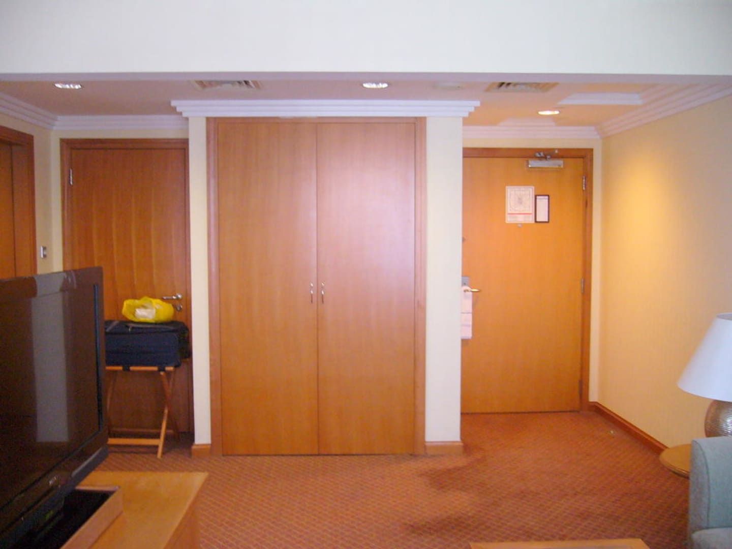 Blick auf den Zimmereingang und den Kleiderschrank mit Beleuchtung und darin der Zimmersafe.
