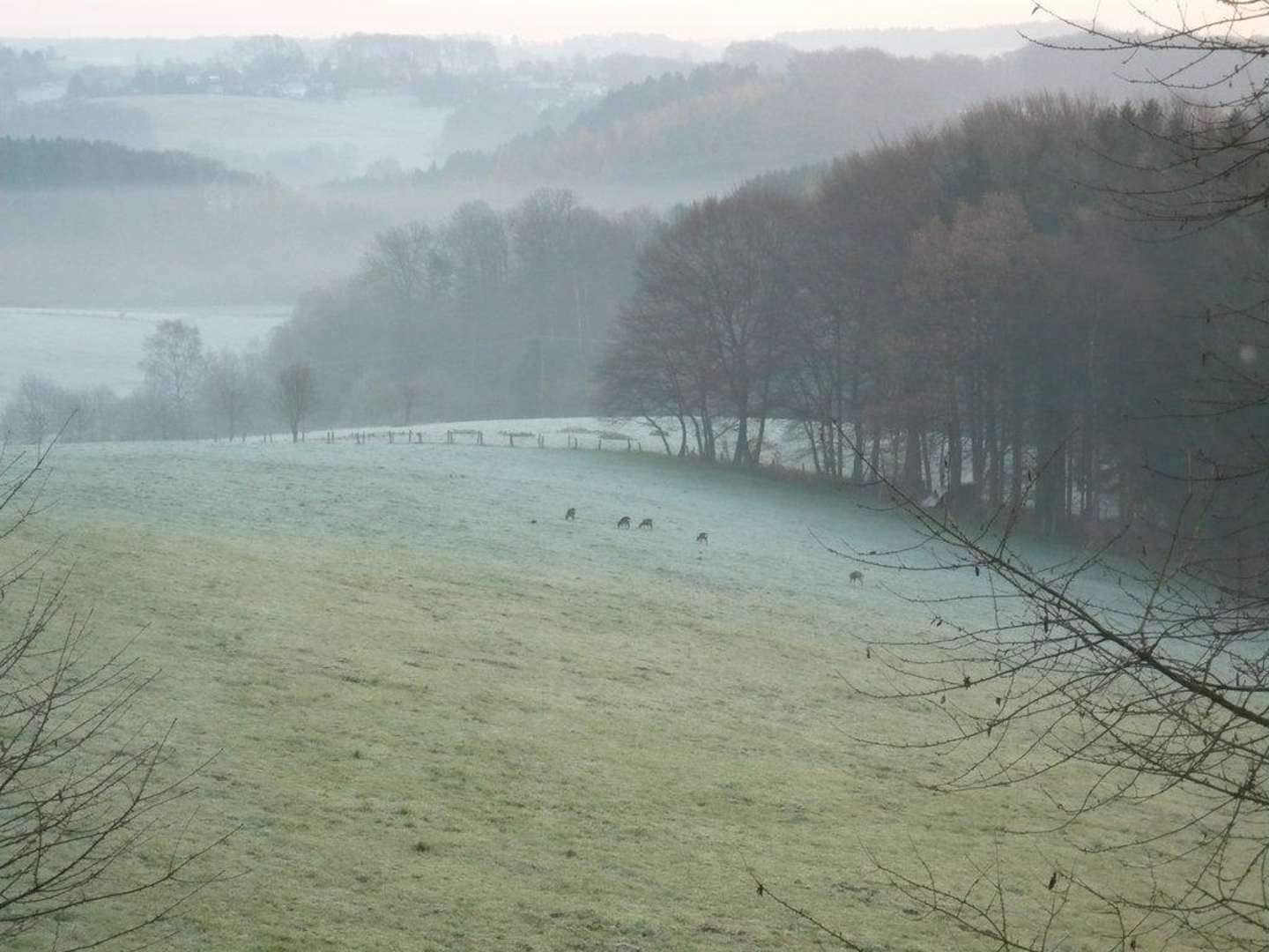 ReheBeim morgendlichen Blick aus dem Fenster konnten wir morgens die Rehe auf den Wiesen beobachten, so schön ruhig ist es dort.