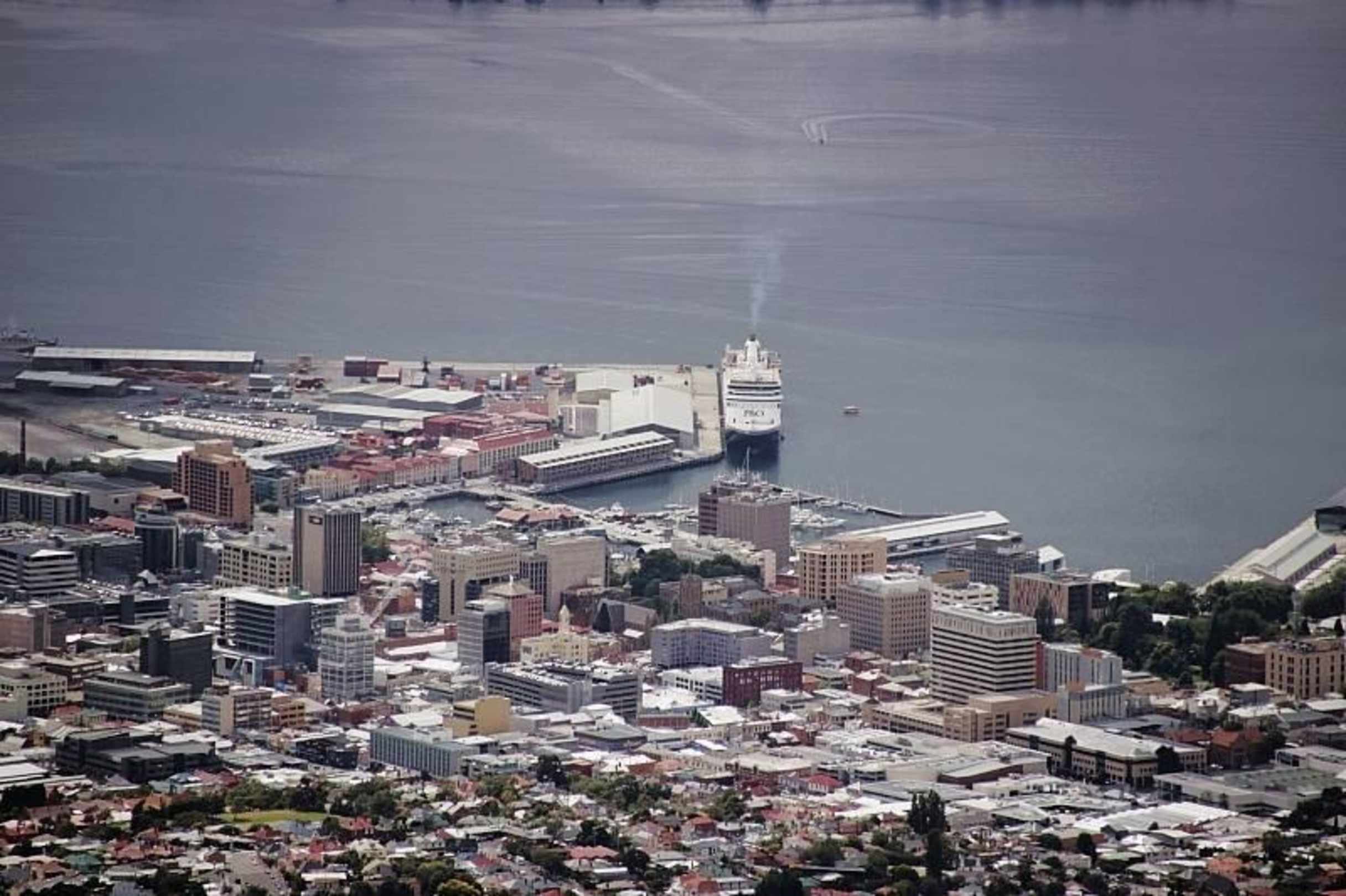 Blick vom Mount Wellington auf das Travelodge Hobart. Es ist von zwei hellen Gebäuden umgeben. Vom Travelodge Hobart ist nur ein schmaler Streifen sichtbar, der wie ein brauner Balken aussieht.
