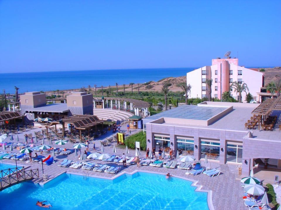 Aussicht vom Zimmerbalkon: Poollandschft und Amphytheater.