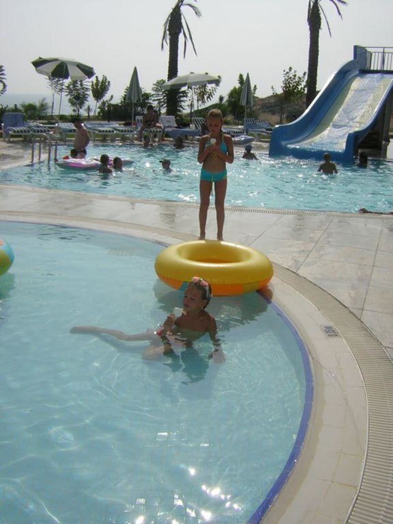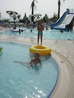 KinderbereichIm Vordergrund day Kleinkindbecken (35 cm). Hinten der Pool mit den weniger hohen Rutschen