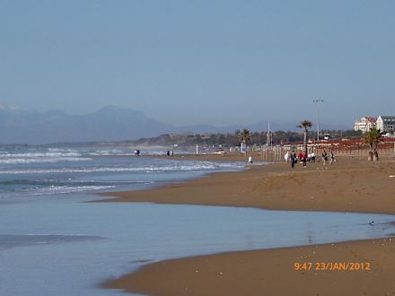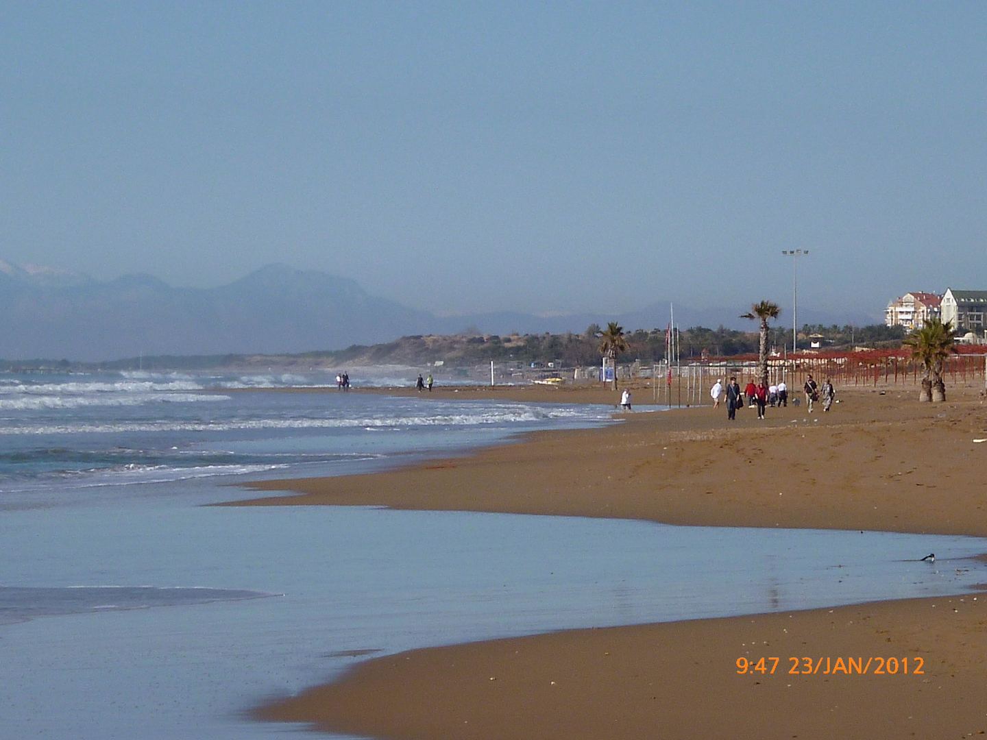 Blick vom Strand in Richtung Hotelblick vom strand aus richtung side mit blick auf das hotel und schneebedeckte taurusgebirge!