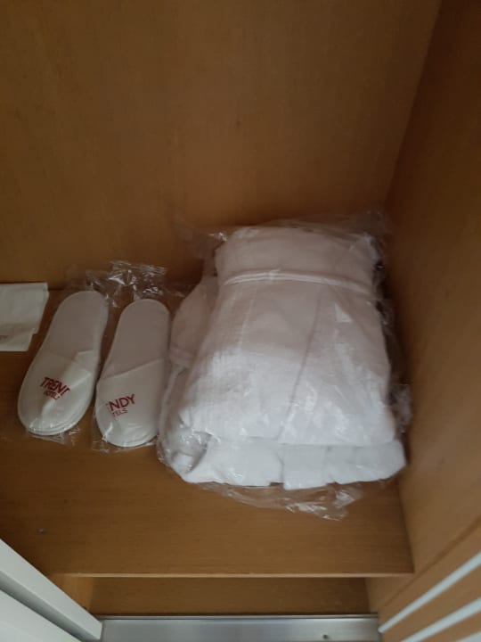 Bademantel und Schlappen liegen bei der Anreise im Schrank