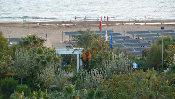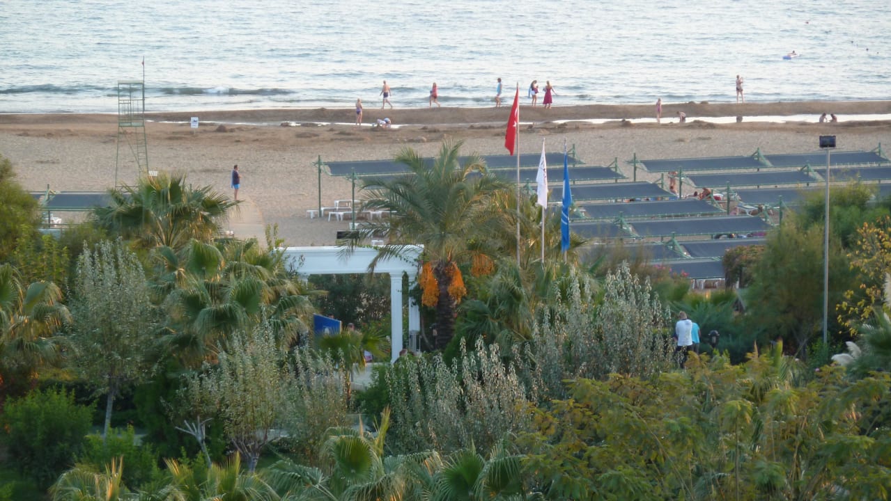 Hotelgarten und Strand mit Schattendächern
