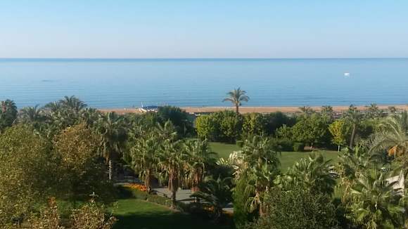 Blick vom Balkon auf den großen Garten u. das Meer